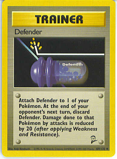 Attach Defender to 1 of your Pokemon. At the end of your opponent's next turn, discard Defender. Damage done to that Pokemon by attacks is reduced by 20 (after applying Weakness and Resistance.)