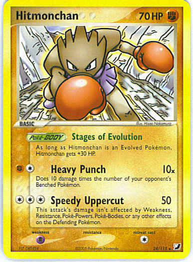 | Type | Fighting | | Pokemon serie | Unseen Forces | | Stadie | Basic | | HP | 70 | | Sjældenhed | Rare | | Tilbagetrækning | 1 | | Svaghed | P | | Kortnummer | 24 | | Evne |