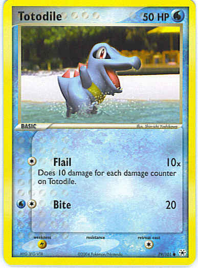 | Type | Water | | Pokemon serie | Hidden Legends | | Stadie | Basic | | HP | 50 | | Sjældenhed | Common | | Tilbagetrækning | 1 | | Svaghed | L | | Kortnummer | 79 | | Evne | [C] Flail (10x) Does 10 damage for each damage counter on Totodile. [CW] Bite (20) | | Evne2 | [C] Flail (10x) Does 10 damage for each damage counter on Totodile. [CW] Bite (20) | | Kunstner | Shin-ichi Yoshikawa |