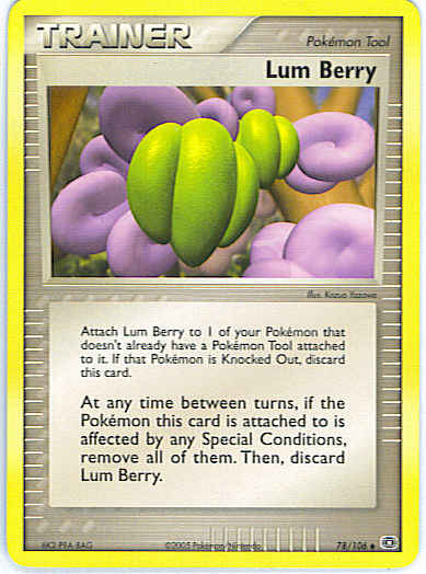 Evne At any time between turns, if the Pokemon this card is attached to is affected by any Special Conditions, remove all of them. Then discard Lum Berry.