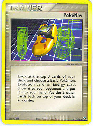 Evne Look at the top 3 cards of your deck, and choose a Basic Pokemon, Evolution, or Energy Card. Show it to your opponent and put it into your hand. Put the 2 other cards back on top of your deck in any order.