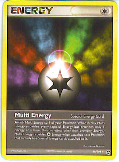 Attach Multi Energy to 1 of your Pokemon. While in play, Multi Energy provides every type of Energy but provides only 1 Energy at a time. (Has no effect other than providing Energy.) Multi Energy provides C Energy when attached to a Pokemon that already has Special Energy cards attached to it.