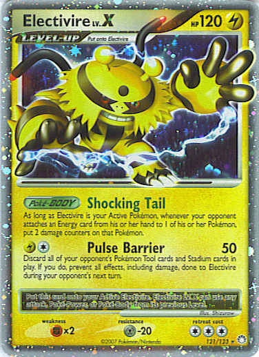 Evne [CL] Pulse Barrier (50) Discard all of your opponent's Pokemon Tool cards and Stadium cards in play. If you do, prevent all effects, including damage, done to Electivire during your opponent's next turn.