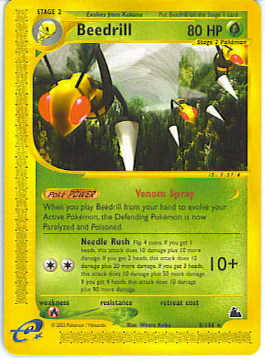 | Type | Grass | | Pokemon serie | Skyridge | | Stadie | Stage 2 | | HP | 80 | | Sjældenhed | Rare | | Svaghed | R | | Kortnummer | 5 | | Evne | [CC] Needle Rush (10+) Flip 4 coins. If you get 1 heads, this attack does 10 damage plus 10 more damage. If you get 2 heads, this attack does 10 damage plus 20 more damage. If you get 3 heads, this attack does 10 damage plus 50 more damage. If you get 4 heads, this attack does 10 damage plus 90 more damage.