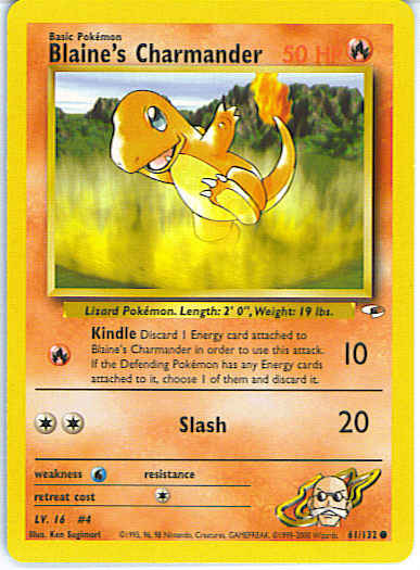 Evne [R] Kindle (10) Discard 1 Energy card attached to Blaine's Charmander in order to use this attack. If the Defending Pokemon has any Energy cards attached to it, choose 1 of them and discard it.