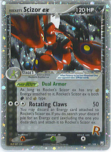 | Type | Darkness | | Pokemon serie | Team Rocket Returns | | Stadie | Stage 1 | | HP | 120 | | Sjældenhed | Ultra-Rare | | Tilbagetrækning | 1 | | Modstand | G | | Svaghed | R | | Kortnummer | 101 | | Evne | [CCC] Rotating Claws (50) You may discard an Energy card attached to Rocket's Scizor ex. If you do, search your discard pile for an Energy card (excluding the one your discarded) and attach it to Rocket's Scizor ex. | | Evne2 | [CCC] Rotating Claws (50) You may discard an Energy card attached to Rocket's Scizor ex. If you do, search your discard pile for an Energy card (excluding the one your discarded) and attach it to Rocket's Scizor ex. | | Kunstner | Hikaru Koike |