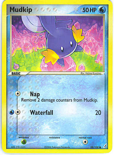 | Type | Water | | Pokemon serie | Crystal Guardians | | Stadie | Basic | | HP | 50 | | Sjældenhed | Common | | Tilbagetrækning | 1 | | Svaghed | G | | Kortnummer | 58 | | Evne | [C] Nap - Remove 2 damage counters from Mudkip. [CW] Waterfall (20) | | Evne2 | [C] Nap - Remove 2 damage counters from Mudkip. [CW] Waterfall (20) | | Kunstner | Hajime Kusajima |