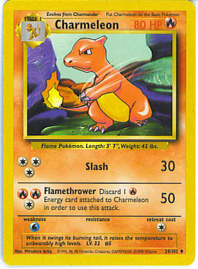 | Type | Fire | | Pokemon serie | Base | | Stadie | Stage 1 | | HP | 80 | | Sjældenhed | Uncommon | | Tilbagetrækning | 1 | | Svaghed | W | | Kortnummer | 24 | | Evne |