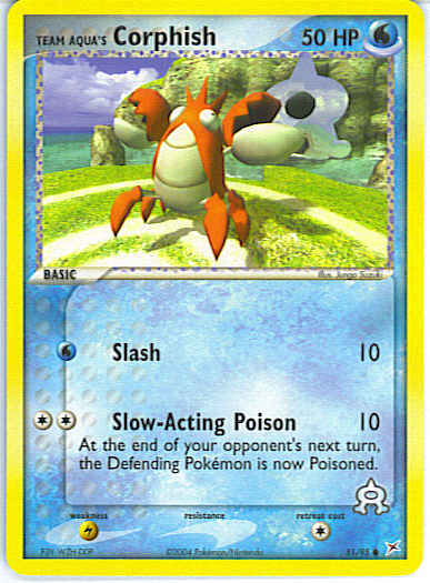| Type | Water | | Pokemon serie | Team Aqua-Team Magma | | Stadie | Basic | | HP | 50 | | Sjældenhed | Common | | Tilbagetrækning | 1 | | Svaghed | L | | Kortnummer | 51 | | Evne | [W] Slash (10) [CC] Slow-Acting Poison (10) At the end of your opponent's next turn, the Defending Pokemon is now Poisoned.