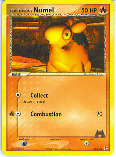 | Type | Fire | | Pokemon serie | Team Aqua-Team Magma | | Stadie | Basic | | HP | 50 | | Sjældenhed | Common | | Tilbagetrækning | 1 | | Svaghed | W | | Kortnummer | 64 | | Evne | [C] Collect - Draw a card. [CR] Combustion (20)