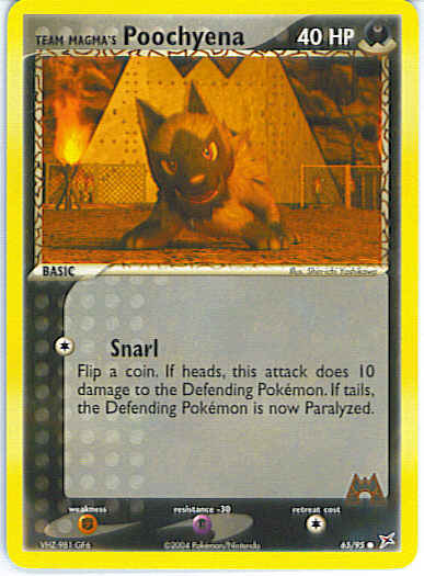 | Type | Darkness | | Pokemon serie | Team Aqua-Team Magma | | Stadie | Basic | | HP | 40 | | Sjældenhed | Common | | Tilbagetrækning | 1 | | Modstand | P | | Svaghed | F | | Kortnummer | 65 | | Evne | [C] Snarl - Flip a coin. If heads, this attack does 10 damage to the Defending Pokemon. If tails, the Defending Pokemon is now Paralyzed.