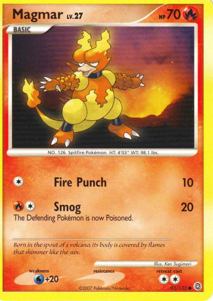 | Type | Fire | | Pokemon serie | Secret Wonders | | Stadie | Basic | | HP | 70.0 | | Sjældenhed | Common | | Tilbagetrækning | 2.0 | | Svaghed | W+20 | | Kortnummer | 93 | | Evne | [C] Fire Punch (10) [CR] Smog (20) The Defending Pokemon is now Poisoned.