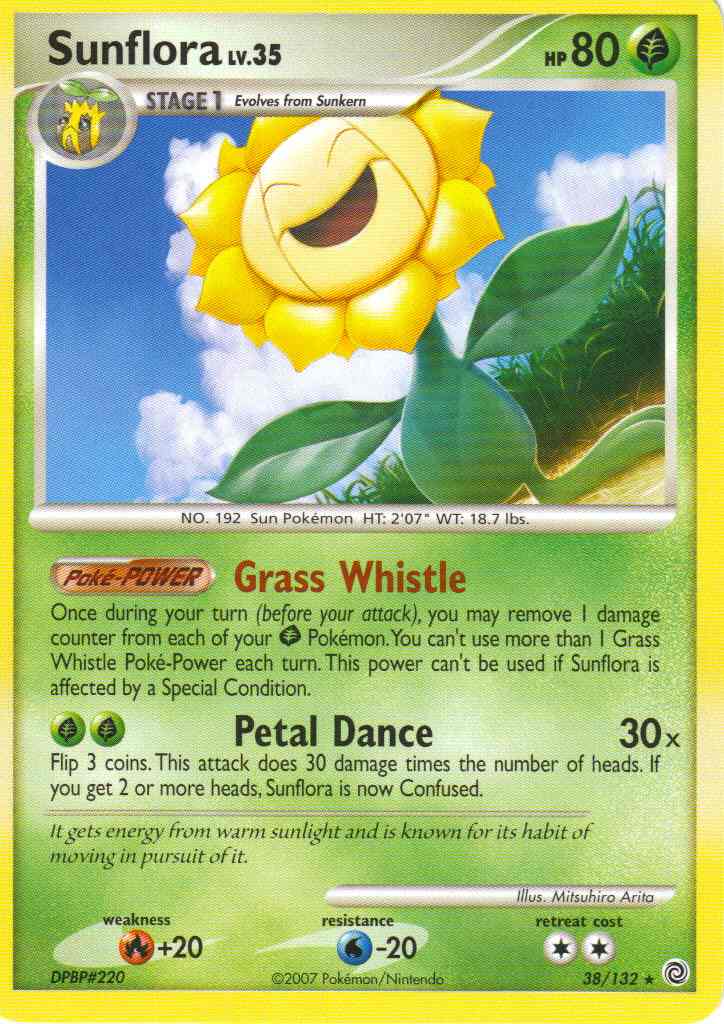 Evne2 [GG] Petal Dance (30x) Flip 3 coins. This attack does 30 damage time the number of heads. If you get 2 or more heads, Sunflora is now Confused.