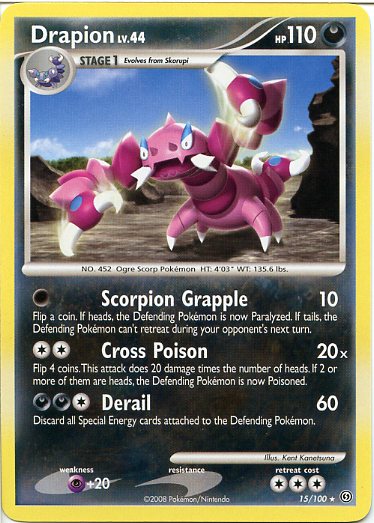 Evne [0] Scorpion Grapple (10) Flip a coin. If heads, the Defending Pokemon is now Paralyzed. If tails, the Defending Pokemon can't retreat during your opponent's next turn.