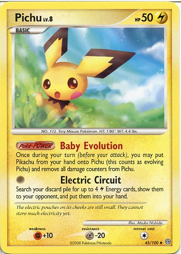| Type | Lightning | | Pokemon serie | Stormfront | | Stadie | Basic | | HP | 50.0 | | Sjældenhed | Uncommon | | Tilbagetrækning | 1.0 | | Modstand | M-20 | | Svaghed | F+10 | | Kortnummer | 45 | | Evne | [0] Electric Circuit - Search your discard pile for up to 4 L Energy cards, show them to your opponent, and put them into your hand.