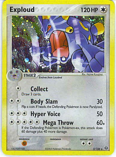 | Type | Colorless | | Pokemon serie | Emerald | | Stadie | Stage 2 | | HP | 120 | | Sjældenhed | Rare | | Tilbagetrækning | 2 | | Svaghed | F | | Kortnummer | 3 | | Evne |
