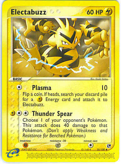 | Type | Lightning | | Pokemon serie | Sandstorm | | Stadie | Basic | | HP | 60 | | Sjældenhed | Uncommon | | Tilbagetrækning | 1 | | Modstand | M | | Svaghed | F | | Kortnummer | 35 | | Evne | [C] Plasma - Flip a coin. If heads, search your discard pile for a L Energy card and attach it to Electabuzz. [CCL] Thunder Spear (40) Choose 1 of your opponent's Pokemon. This attack does 40 damage to that Pokemon. (Don't apply Weakness and Resistance for Benched Pokemon.)