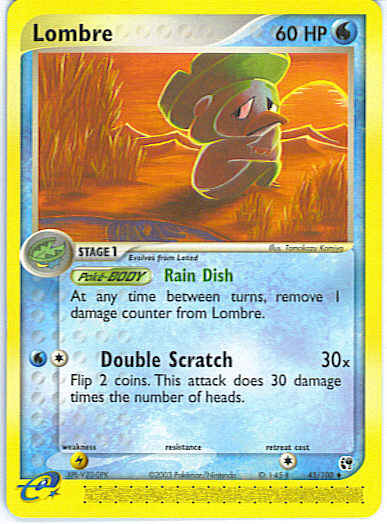 | Type | Water | | Pokemon serie | Sandstorm | | Stadie | Stage 1 | | HP | 60 | | Sjældenhed | Uncommon | | Tilbagetrækning | 1 | | Svaghed | L | | Kortnummer | 45 | | Evne | [CW] Double Scratch (30x) Flip 2 coins. This attack does 30 damage times the number of heads.