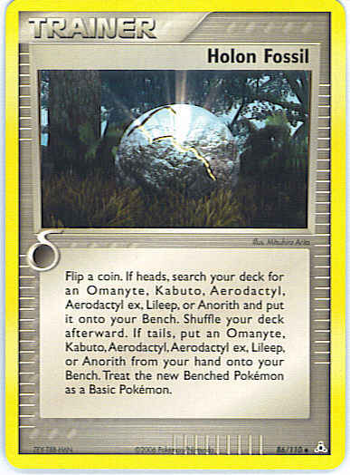 Evne Flip a coin. If heads, search your deck for an Omanyte, Kabuto, Aerodactyl, Aerodactyl ex, Lileep, or Anorith and put it onto your Bench. Shuffle your deck afterward. If tails, put an Omanyte, Kabuto, Aerodactyl, Aerodactyl ex, Lileep, or Anorith from you